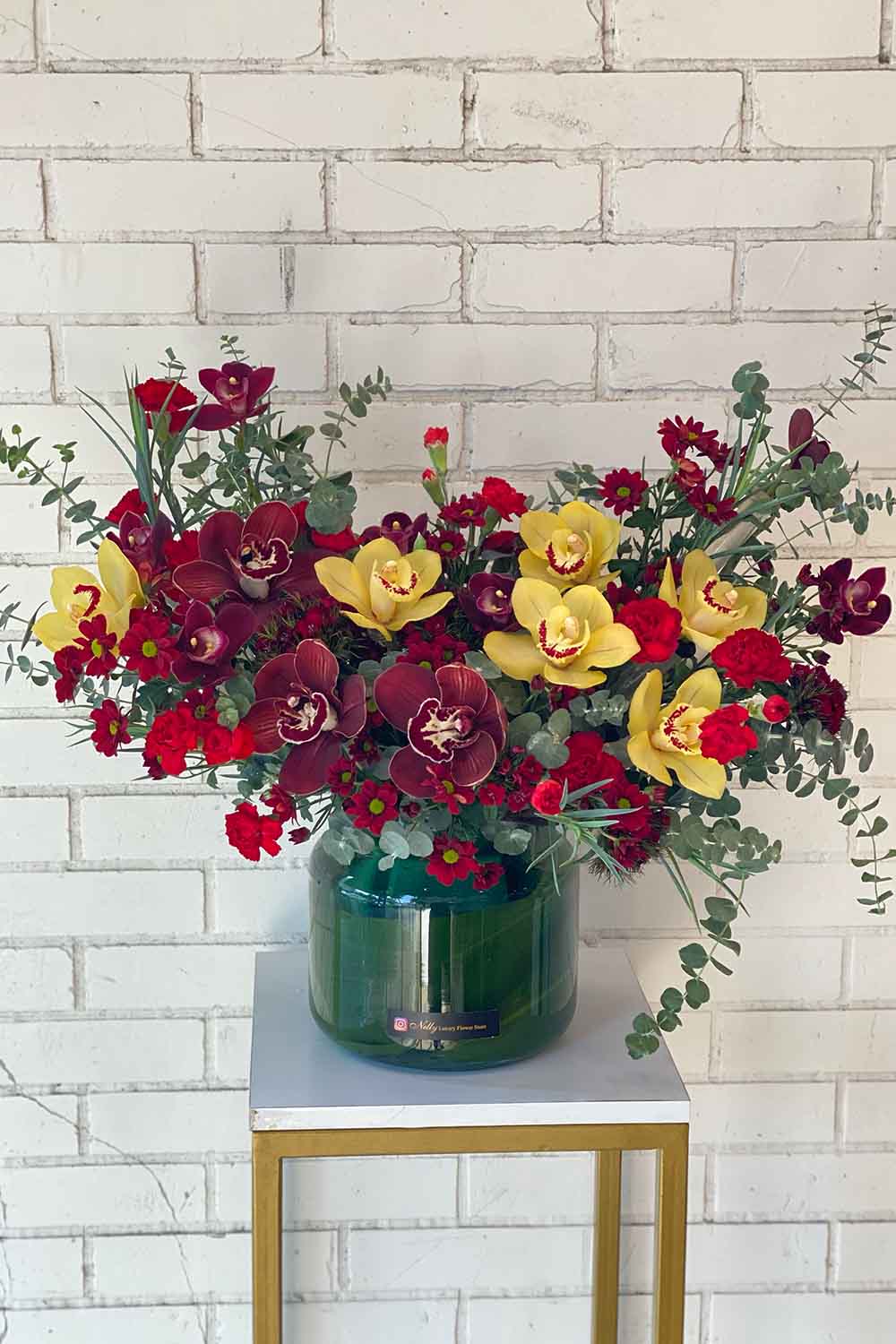 در این محصول از ارکیدههای باکیفیت و تازه استفاده شده که با چیدمانی حرفهای و متناسب با سلیقه لاکچری طراحی شدهاند. گلدان شیشهای شفاف، جلوه گلها را دوچندان کرده و حس ظرافت و اصالت را منتقل میکند.