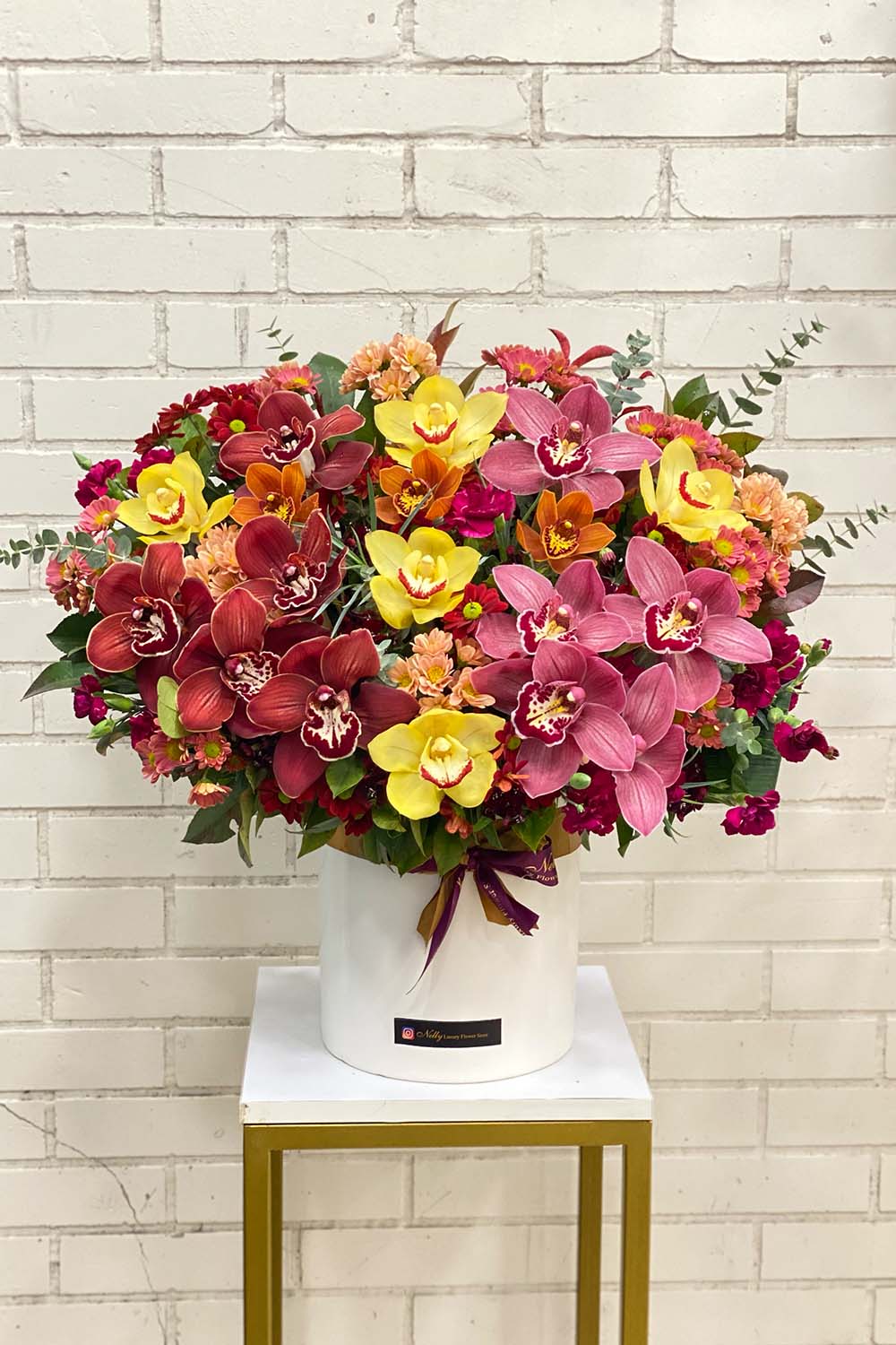 باکس تمام ارکیده سیمبیدیوم ۵۵ سانتی نلی، انتخابی لوکس و متفاوت برای هدیههای خاص و مناسبتهای رسمی است.