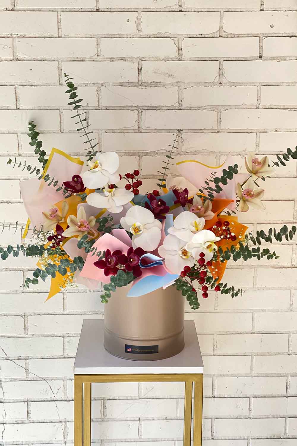 دیزاین شامل ارکیده های کرم زرشکی و ارکیده های فلانوپسیس سفید میباشد.