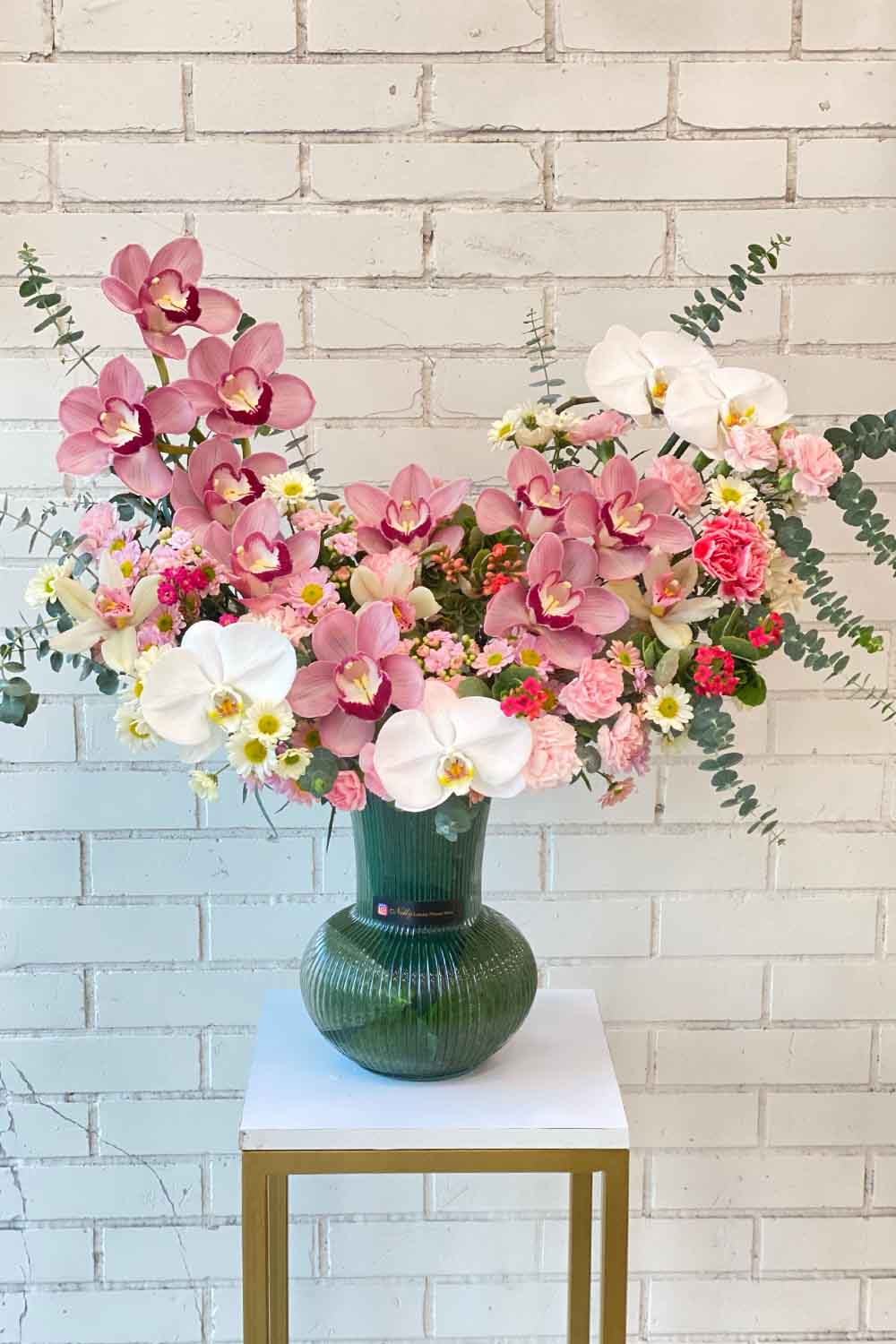 در این دیزاین، ارکیدههای سیمبیدیوم باکیفیت و ماندگاری بالا با چیدمانی حرفهای در گلدان شیشهای قرار گرفتهاند تا جلوهای مدرن، شفاف و بسیار شکیل ایجاد شود.