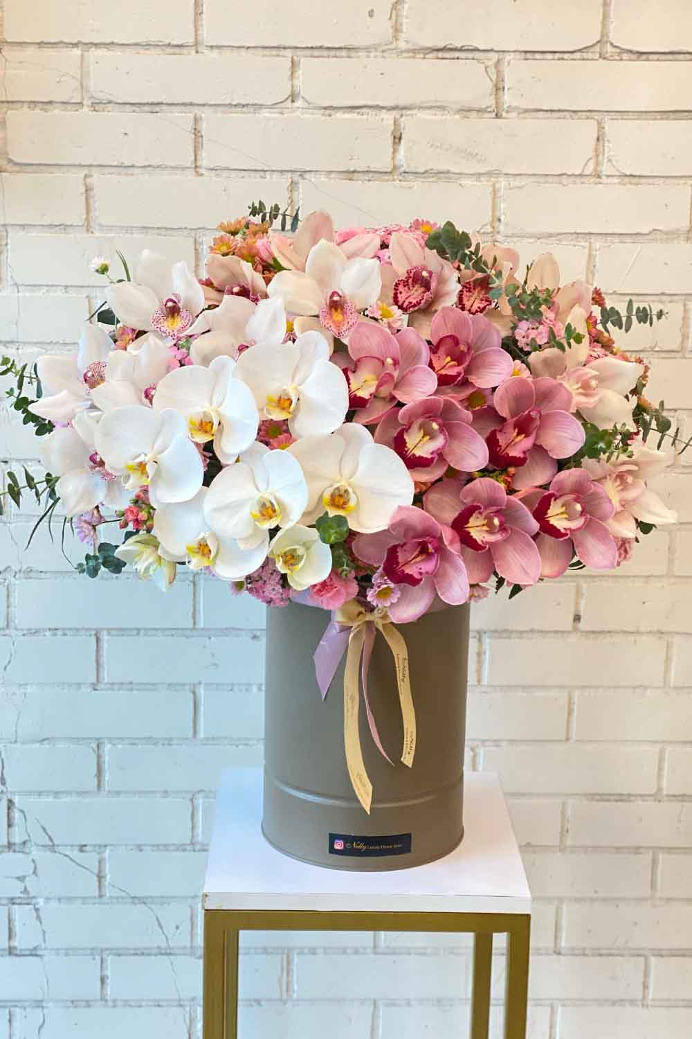 باکس گل تمام ارکیده نلی سایز بزرگ ۷۵ سانت، انتخابی شیک و لوکس برای مناسبتهای خاص است. این دیزاین خاص با ترکیبی از ارکیدههای سیمبیدیوم و فلانوپسیس تازه، با چیدمانی حرفهای و بستهبندی شکیل آماده میشود.
