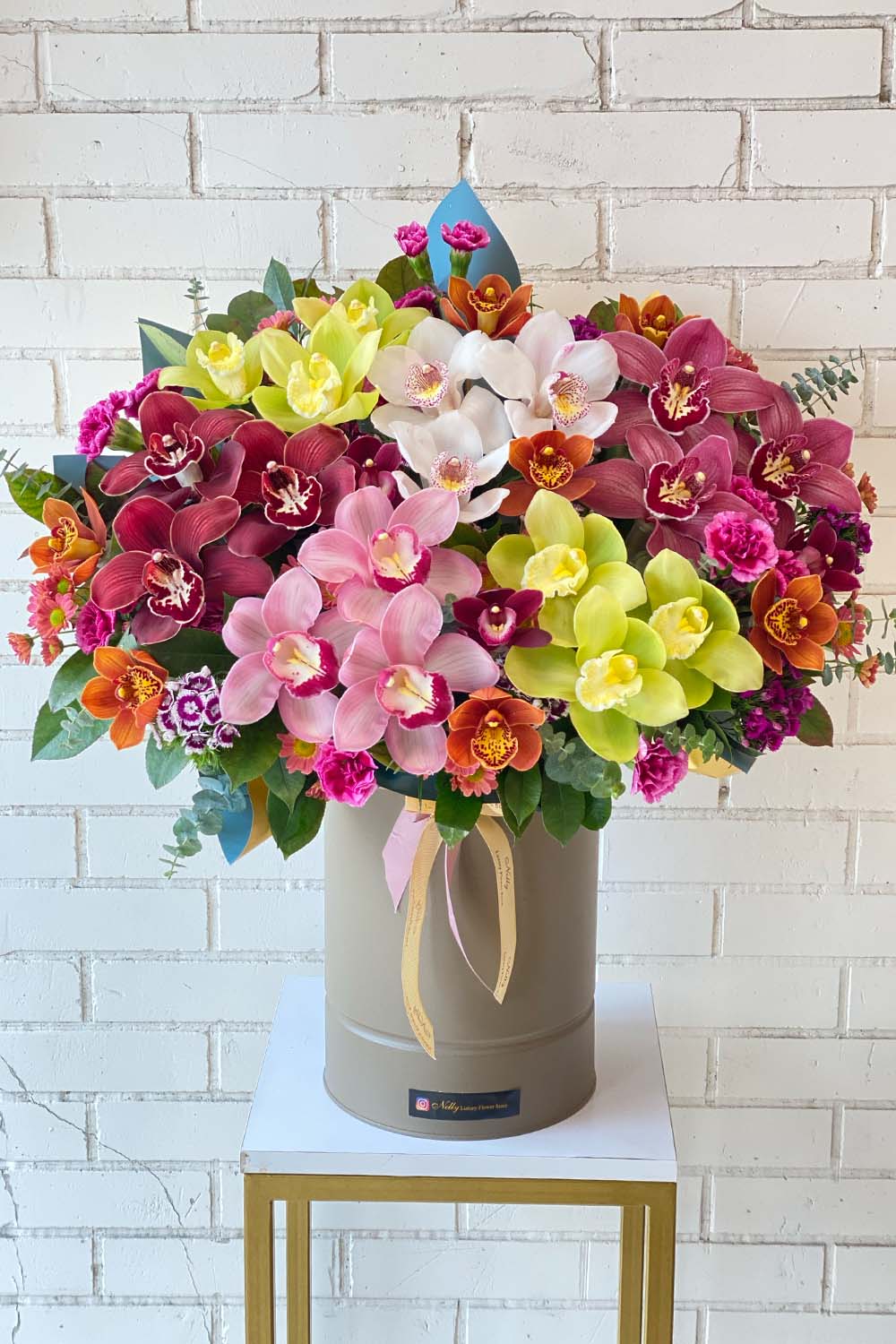 باکس لوکس ۸۰ سانتی تمام ارکیده سیمبیدیوم نلی، یکی از شاخصترین و مجللترین دیزاینهای ارکیده برای هدیههای بسیار خاص و سلیقههای لوکس است.