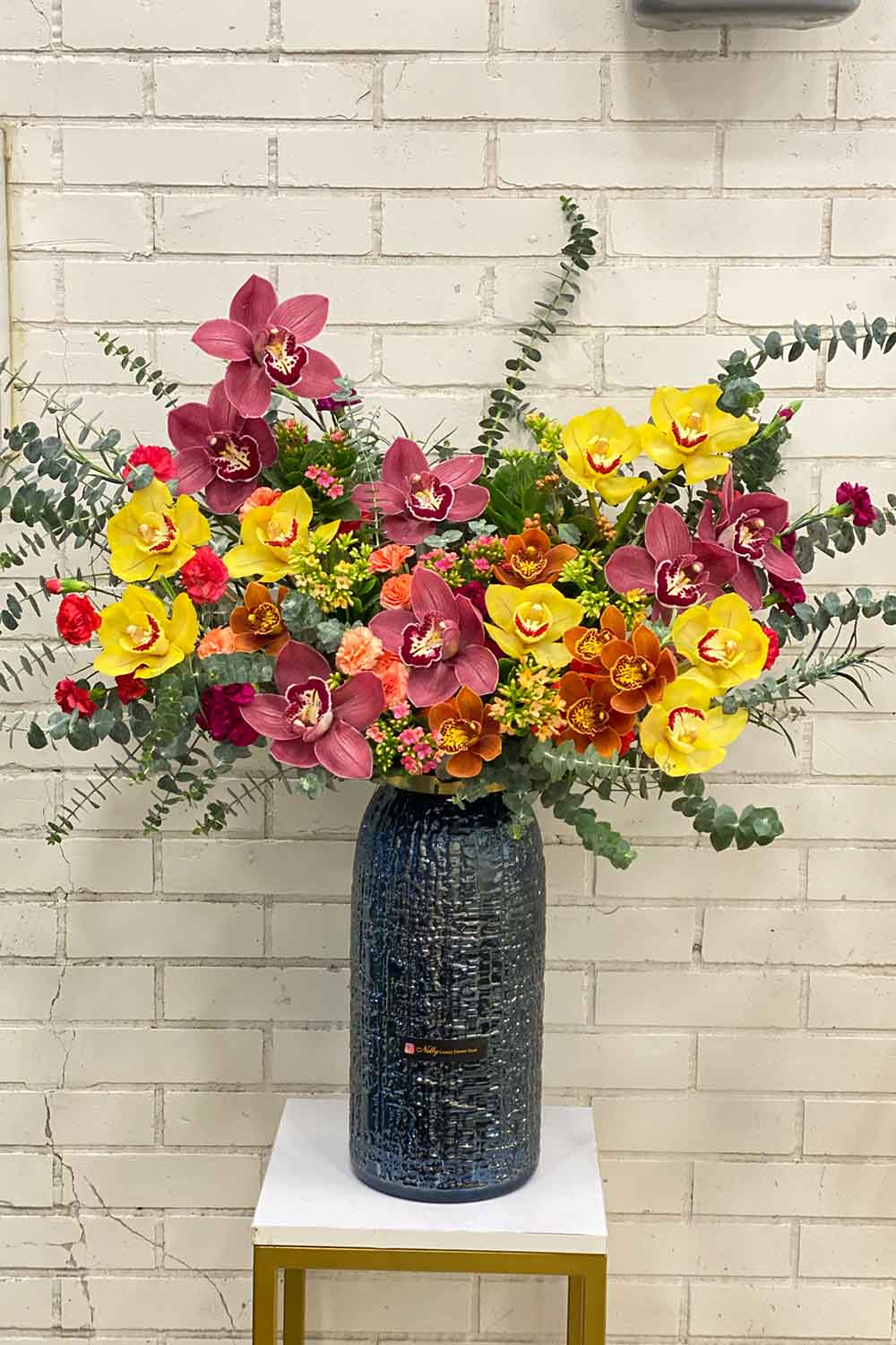 ترکیب رنگ سورمهای گلدان با ارکیدههای سیمبیدیوم باکیفیت و ماندگاری بالا، جلوهای باشکوه، عمیق و کاملاً لاکچری ایجاد میکند که این محصول را به انتخابی ممتاز تبدیل کرده است.